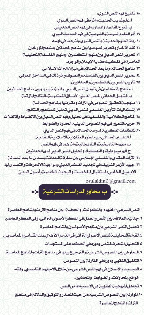 - القراءة التحليلية للنص الأصولي التراثي في الدَّرس الأزهري عند القدامى والمعاصرين.